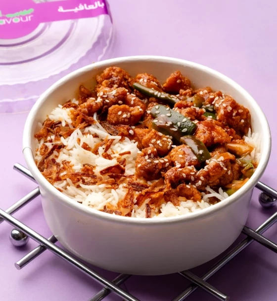 استمتع بوجبة متكاملة من الدجاج الصيني الشهي، المحضّر من صدور الدجاج الطرية والمتبلة بمزيج لذيذ من البهارات الآسيوية. يُقدّم مع الأرز الأبيض المطهو بعناية، ويُزين بالفلفل الرومي الطازج، والبصل الأبيض المكرمل، ورشة من السمسم لتعزيز النكهة.