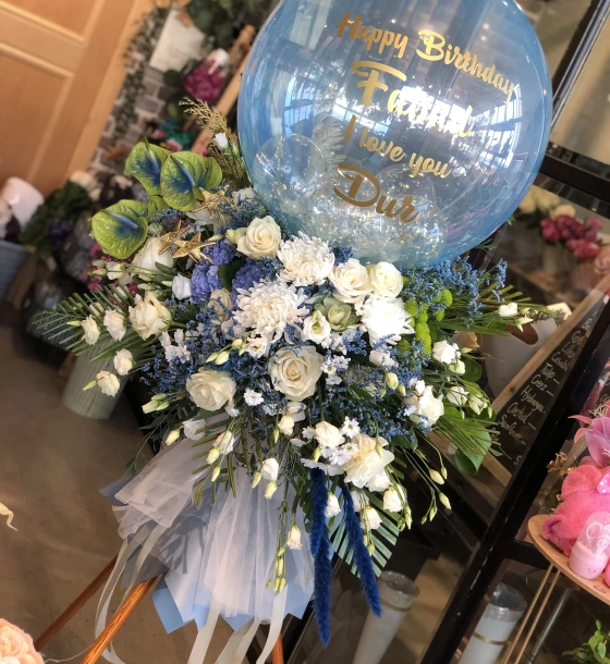 باقة ورد طبيعي كبيرة مع بالون يحمل كتابة حسب الطلب، مثالية لجميع المناسبات. عند الطلب عبر الموقع الإلكتروني، نضمن توصيل الباقة بسرعة وفي الوقت الذي تختارينه، مع إمكانية تخصيصها بما يتناسب مع ذوقك الخاص.