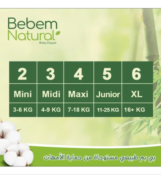 توفر حفاضات بيبيم ناتشورال جونيور لطفلكِ الجفاف والراحة لفترات طويلة بفضل تصميمها الفريد الذي يحتوي على منطقة امتصاص إضافية تمنع التسربات وتحافظ على بشرة الطفل جافة ومحمية. كما يتميز تصميمها المرن بزاوية 360 درجة بتغطية مثالية لخصر الطفل وساقيه، مما يضمن حماية موثوقة دون تقييد الحركة.