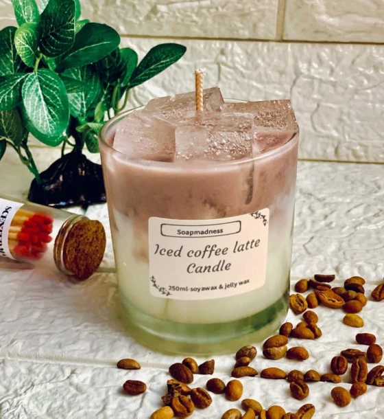 شمعة آيس لاتيه – عبق القهوة وفخامة الزجاج لتجربة صباحية مميزة